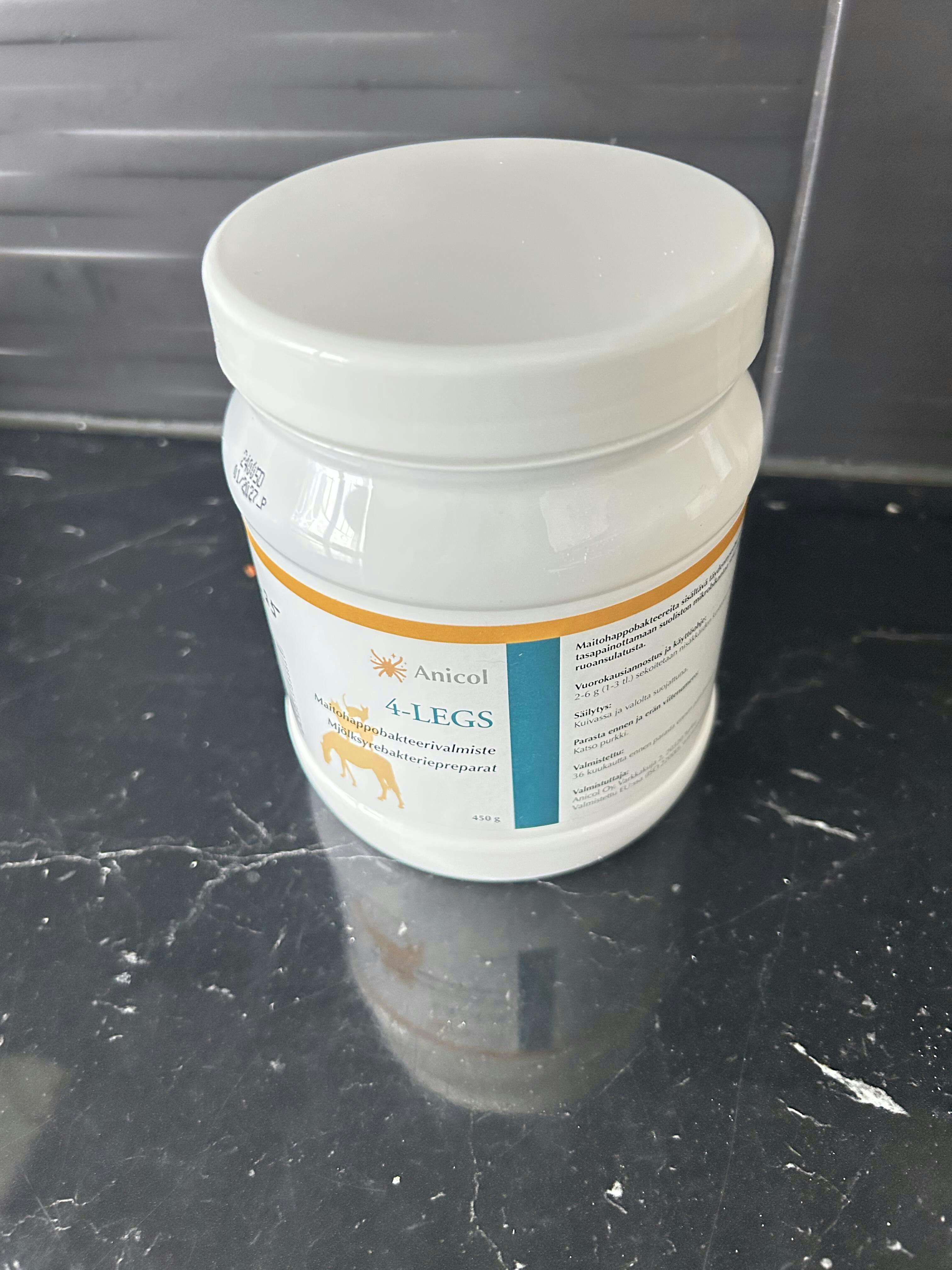 Anicol 4-LEGS on grammantarkasti valmistettu, luonnollinen ja 100 % allergiatestattu täydennysrehu, joka sisältää suolistoflooraa stabiloivia maitohappobakteereja.